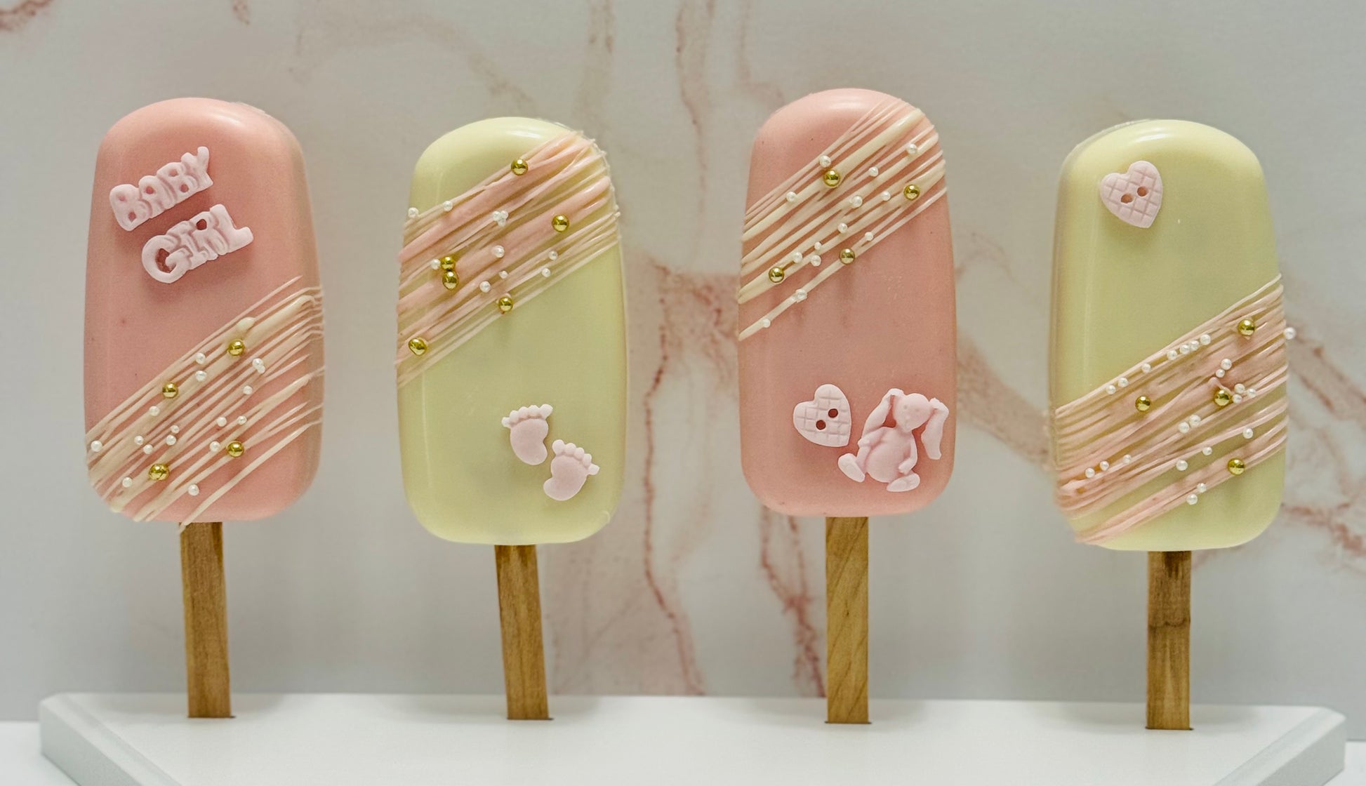 Welcome your little one with our Baby Shower Cakesicles, crafted in soft pastel pink-and-white or blue-and-white designs.