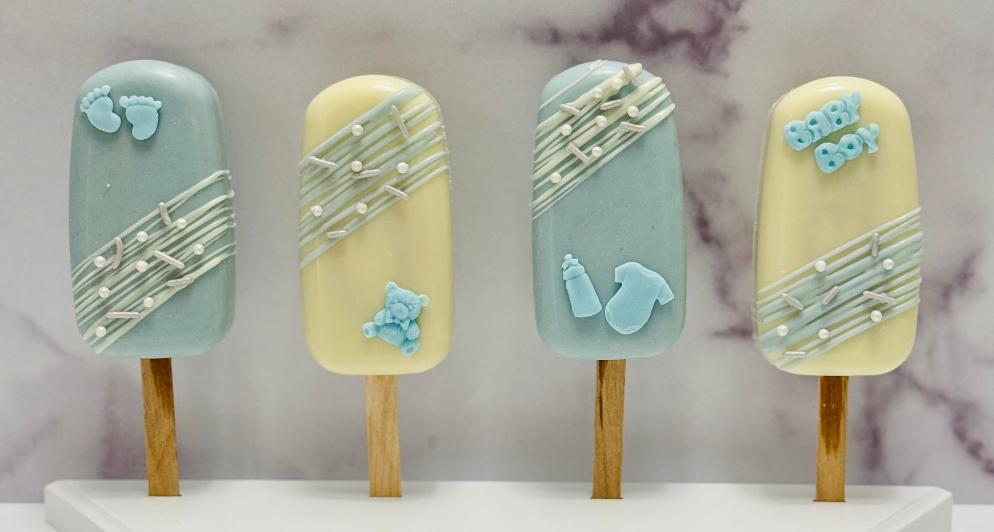 Each cakesicle is decorated with charming baby-themed details, making them as adorable as they are delicious.