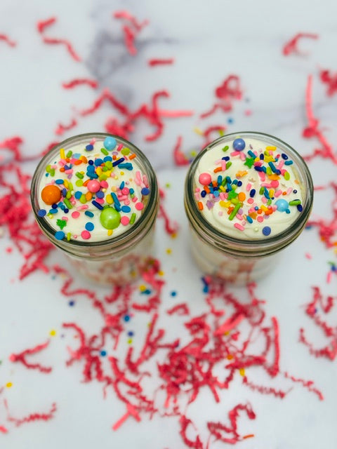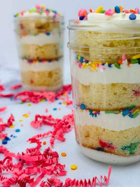 Each jar is layered with moist funfetti cake, creamy white buttercream, and colorful sprinkles for the perfect balance of flavor and fun.
