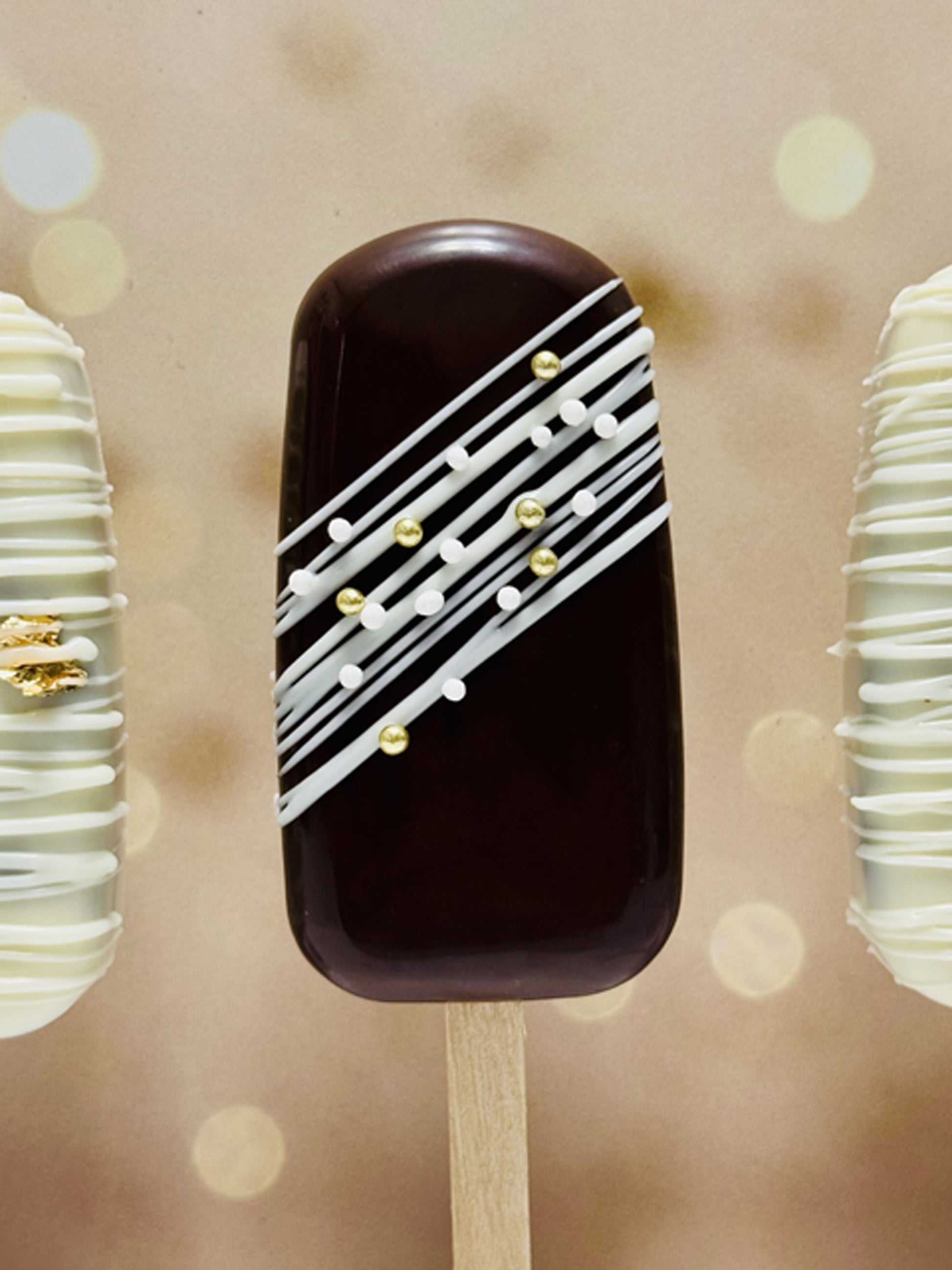 Each handcrafted cakesicle features moist cake dipped in silky chocolate and finished with refined decorative designs.