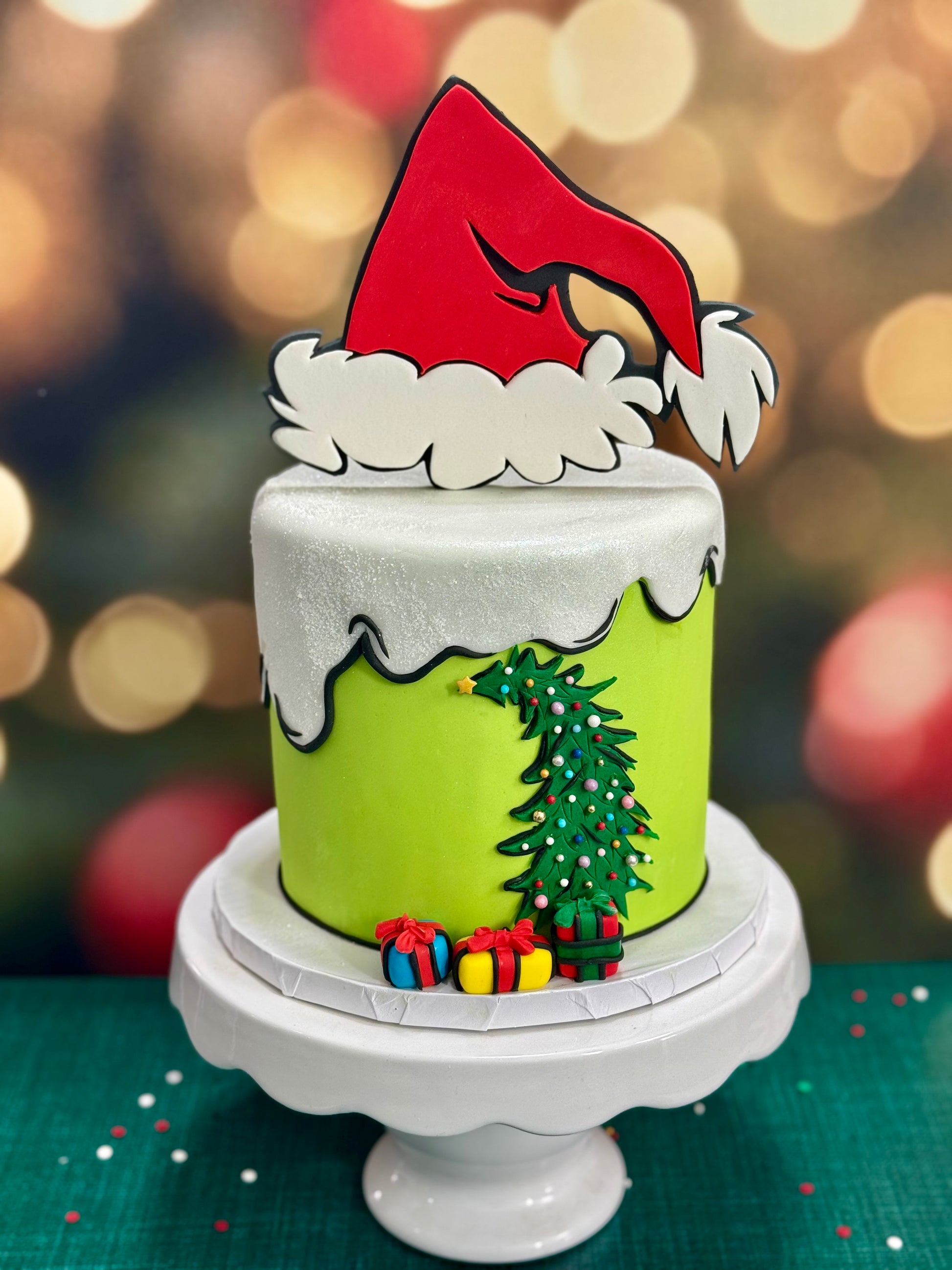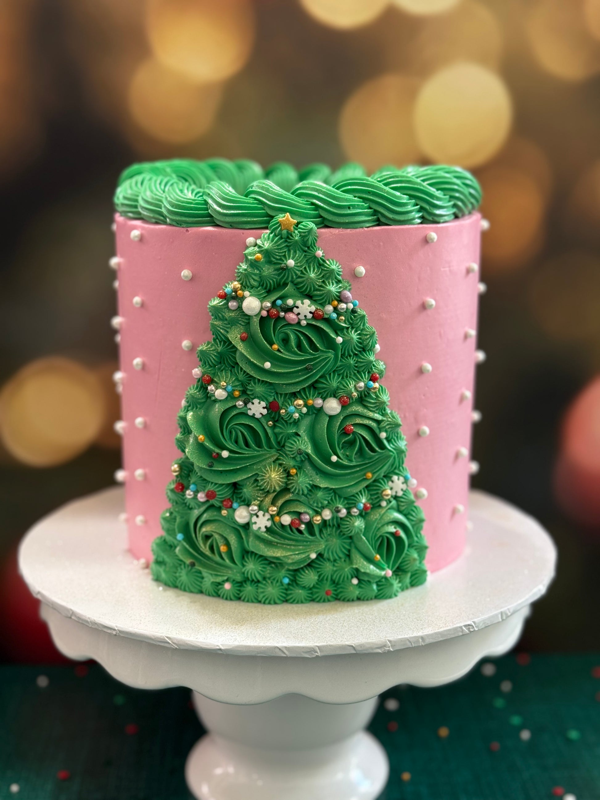 Pick the elegant pink buttercream adorned with a piped Christmas tree and shimmering colored edible pearls, the whimsical Grinch-inspired cake featuring cartoon flair with 3D edible gifts and a Christmas tree, the charming winter wonderland with layered blue and white buttercream topped by a cheerful 3D snowman surrounded by delicate snowflakes, or the elegant gold buttercream cake with green wreath and piping