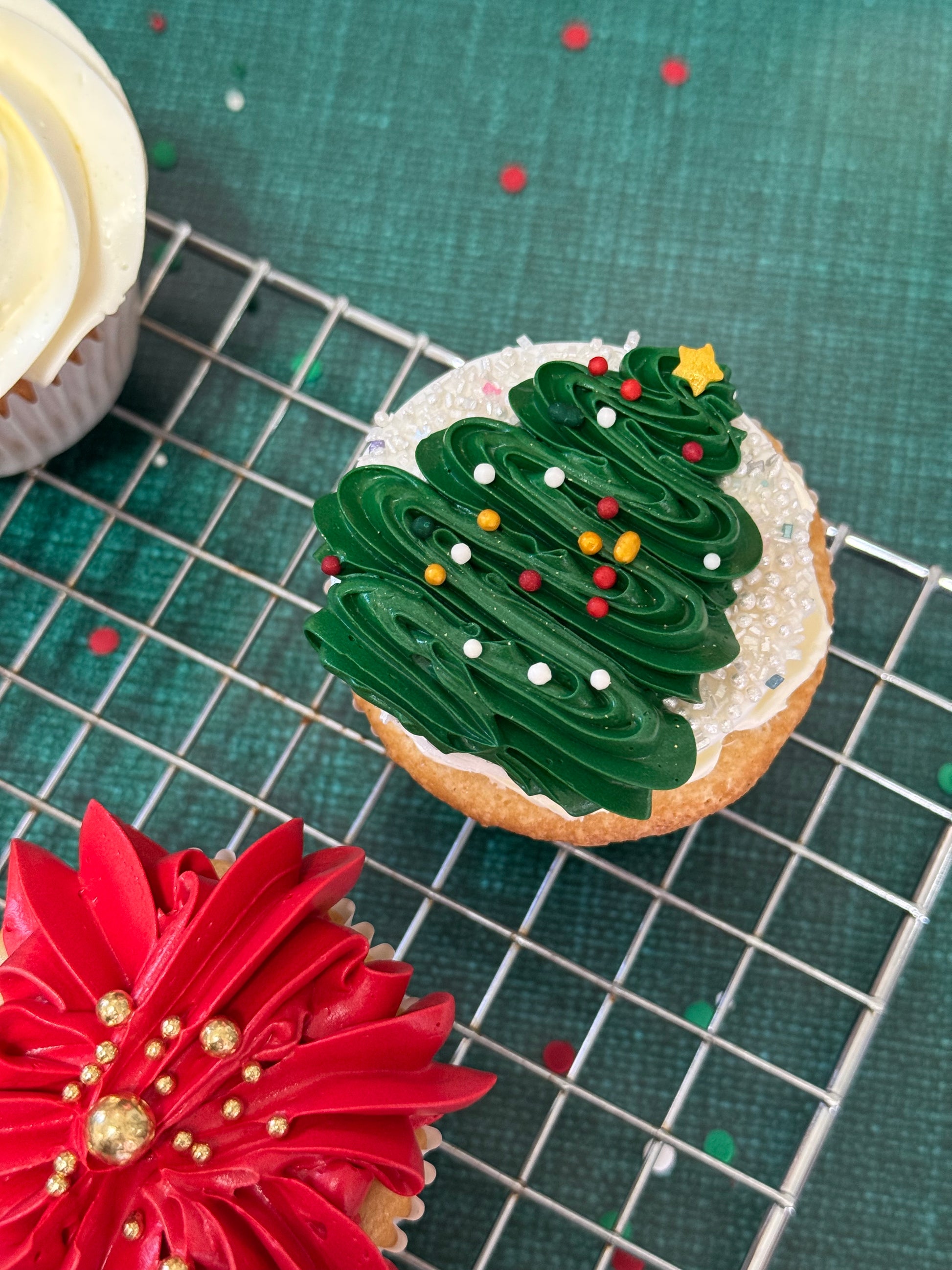 Each box features an assortment of beautifully decorated treats topped with creamy buttercream and adorned with piped designs— cheerful Christmas trees, vibrant poinsettias, classic wreaths, and elegant rosettes.