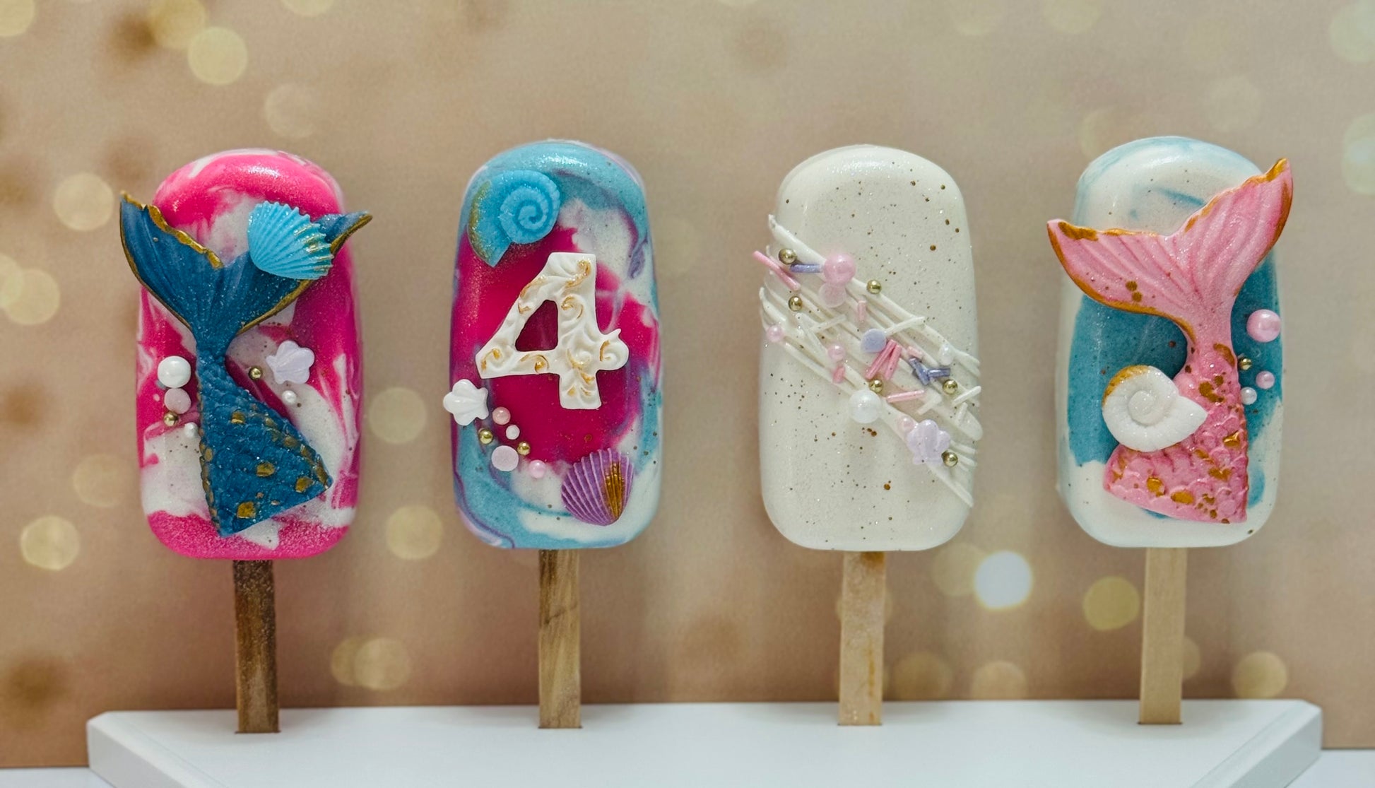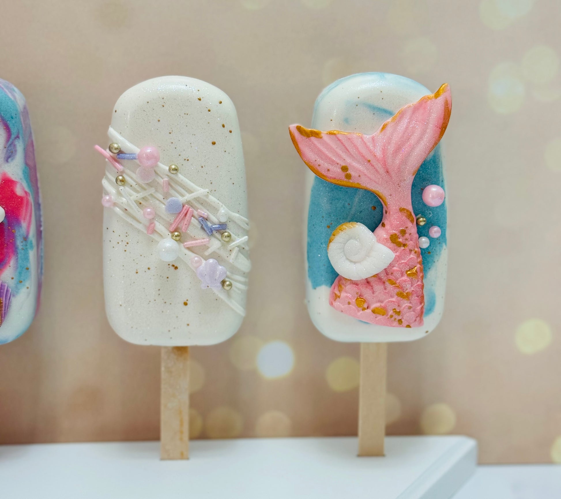 Celebrate ocean magic with our Mermaid Cakesicles, dipped in vibrant pink, blue, and white chocolate.