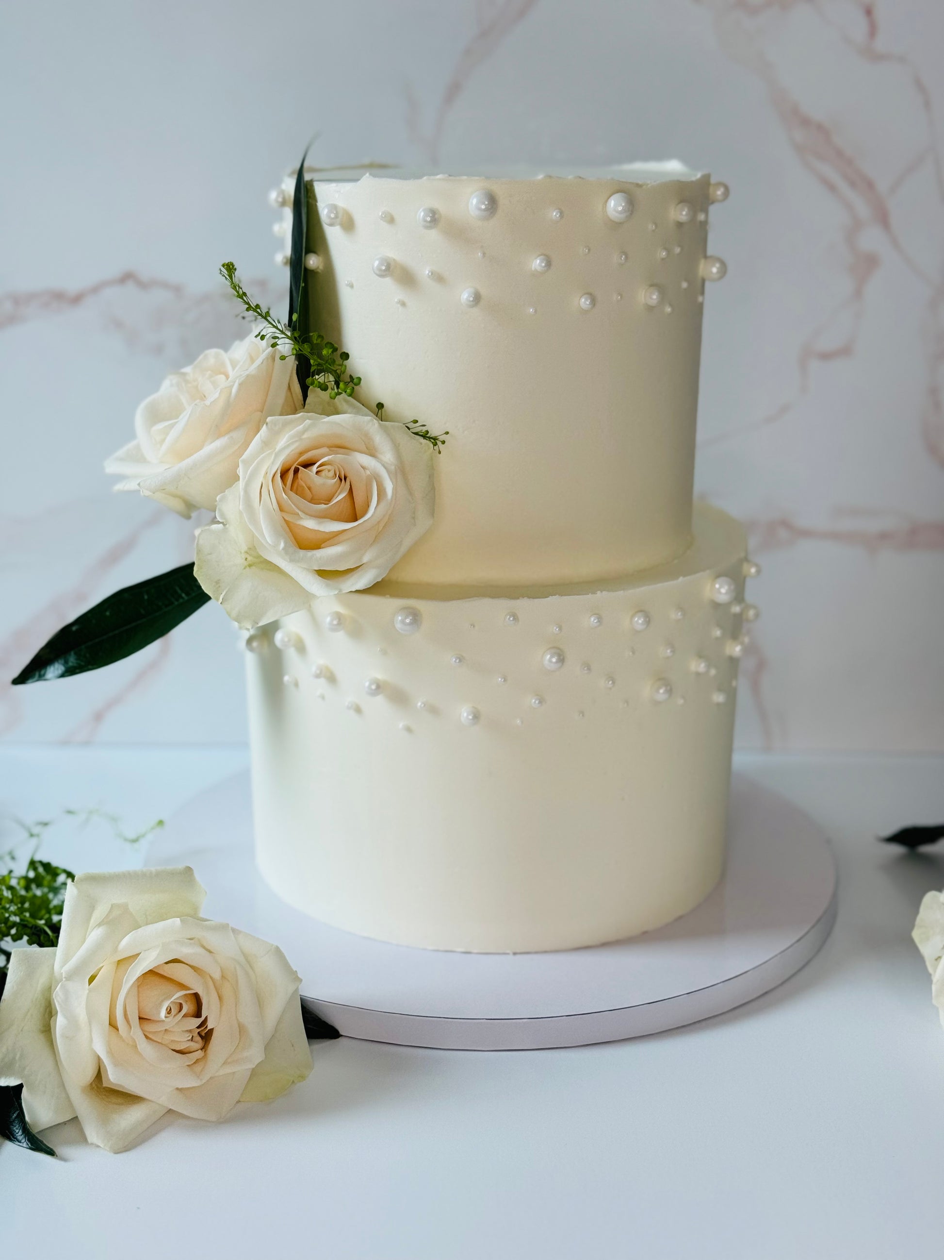 The Pearl Buttercream Cake features smooth, elegant buttercream adorned with carefully placed roses that add elegance and beauty.